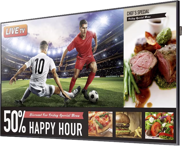 350 nits, 49 tommer, leveres på SMS-stativ med HDMI-kabel.