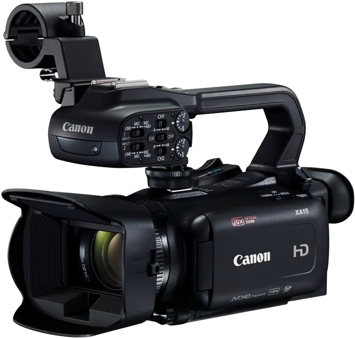 Canon XA15 videokamera med SDI ut. Stativ type Benro eller Manfrotto medfølger. Kan lagre til SD-kort, støtter ekstern mikrofon på XLR, to batteri medfølger. I softbag.